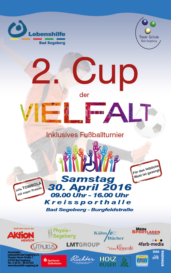 "2. Cup der Vielfalt" (30.04.2016) Inklusives Fußballturnier mit 12 Mannschaften. Kreissporthalle, 23795 Bad Segeberg. Veranstalter: Lebenshilfe Bad Segeberg und Trave-Schule (Förderzentrum für geistige Entwicklung) Bad Segeberg, gefördert von Aktion Mensch. PDF